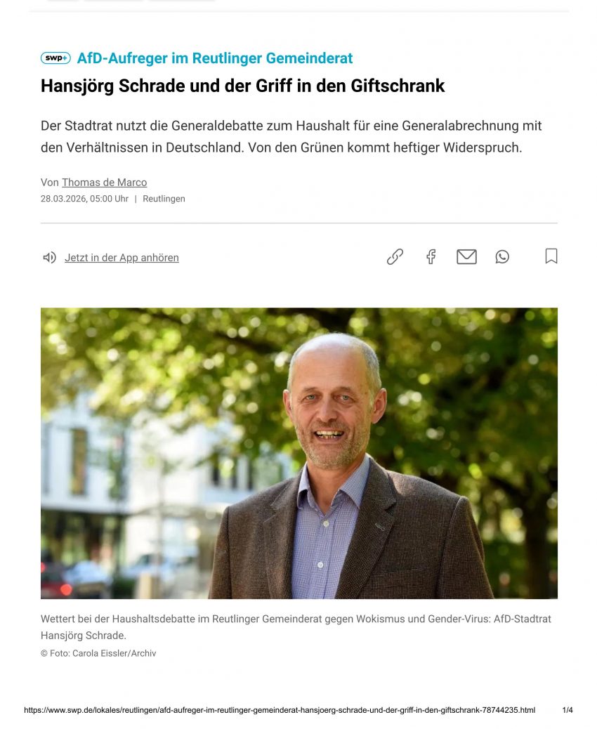 Besonders der SWP-Artikel von Thomas de Marco (28.03.2026) ist rein polemisch und konzentriert sich ausschließlich auf die stilistisch provokante Einleitung und die bundespolitischen Passagen der Haushaltsrede von Hansjörg Schrade.
